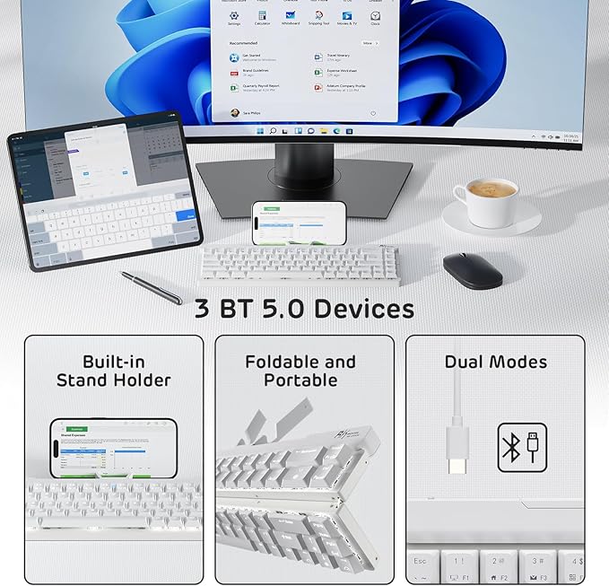 - RK ROYAL KLUDGE F68 60% Foldable Low Profile Mechanical Keyboard, Wireless Mechanical Keyboard with Aluminum Body, Built-in Stand Holder, White Backlit, 68 Keys, Quiet Red Switch
