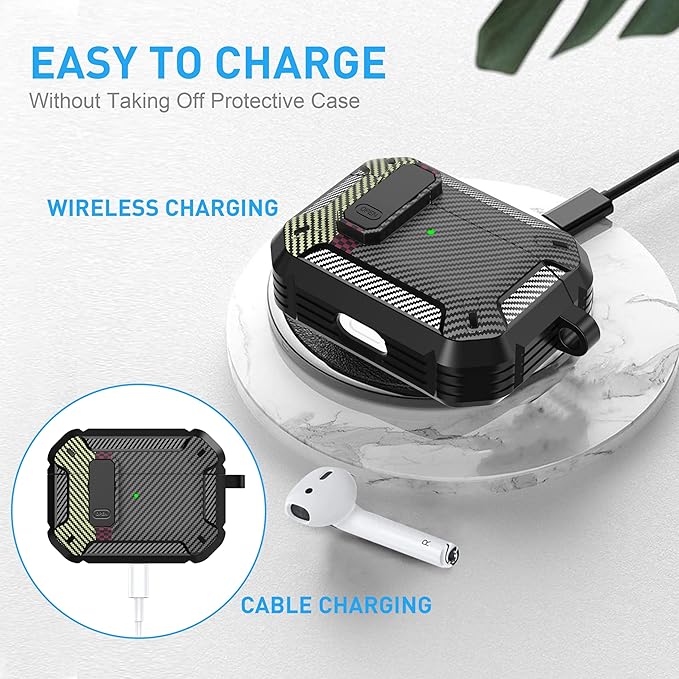 - 【Military AirPods Pro Cover with Secure Lock】 Military shockproof Airpods Pro cover made of TPU and PC materials to makes the AirPods Pro case anti-shock, anti-slip and anti-fingerprint. Secure lock design, easy to open and close top cover with the open button