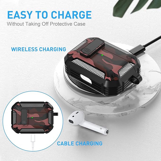 - 【Military AirPods Pro Cover with Secure Lock】 Military shockproof Airpods Pro cover made of TPU and PC materials to makes the AirPods Pro case anti-shock, anti-slip and anti-fingerprint. Secure lock design, easy to open and close top cover with the open button