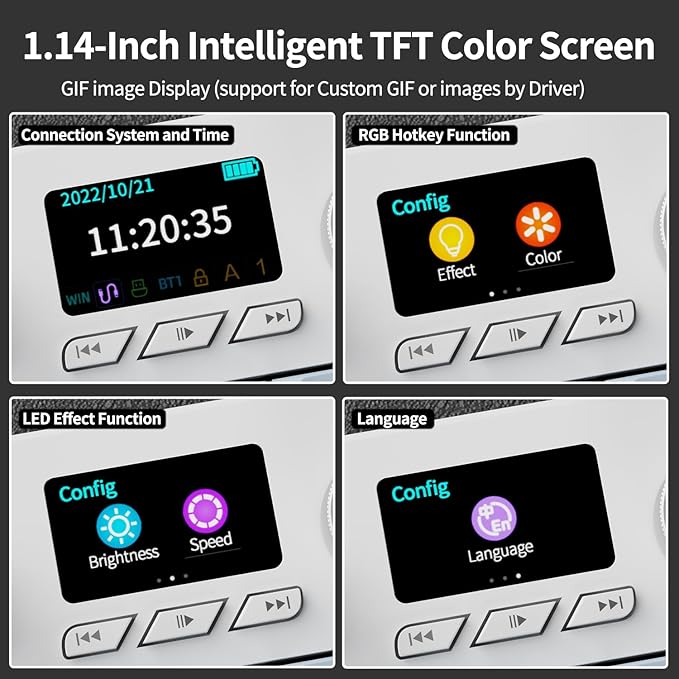 - 【Smart TFT Display Screen and Knob】Full size gaming mechanical keyboard has unique metal knob inspired by the shape of PVZ's trash can and improved for comfort, and knob can quickly adjust complex functions: connection, system, backlight brightness/speed , RGB mode/color, volume and language. Built-in smart TFT color display screen, you can quickly check the status of the keyboard, including custom gif images (by the driver), connection mode, time, lighting effects, power, etc.