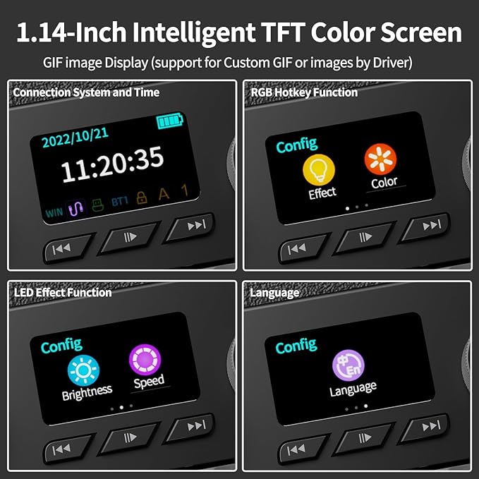 - 【Smart TFT Display Screen and Knob】Full size gaming mechanical keyboard has unique metal knob inspired by the shape of PVZ's trash can and improved for comfort, and knob can quickly adjust complex functions: connection, system, backlight brightness/speed , RGB mode/color, volume and language. Built-in smart TFT color display screen, you can quickly check the status of the keyboard, including custom gif images (by the driver), connection mode, time, lighting effects, power, etc.