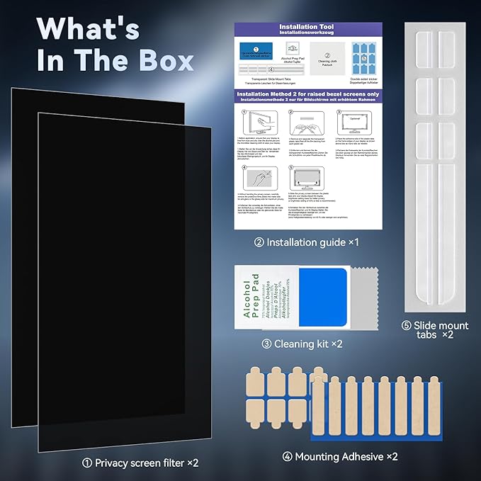 - 【Package Content】You can get 2pcs 28 inch computer monitor privacy screen filter for a better price! Each package includes 28 inch privacy screen film x2, adhesive strips x2, slide mount tabs x2, alcohol x2, cleaning cloth x2. We are a factory that integrates production, processing and sales, We guarantee that all of our products are premium privacy screen protector. If anything happens, we will send you a new 28 inch monitor privacy screen at absolutely no cost. So you can buy with confidence!