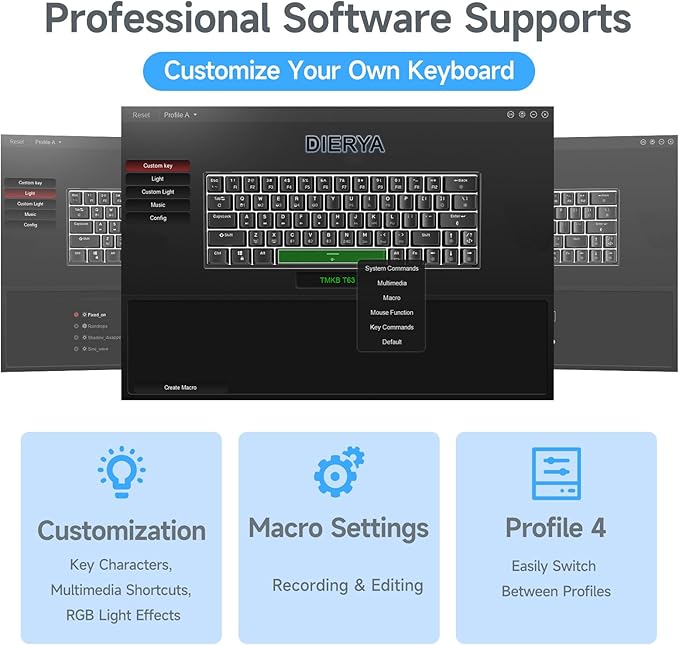 - Keyboard Description : The DIERYA T63 is a compact 60% wireless mechanical gaming keyboard with 63 keys, including directional keys. It utilizes 'FN' key to execute all functions while retaining full functionality, freeing up more desktop space. features independently developed red switches, characterized by linear and lighter feel, single-press lifespan of 60 million times. supports 2.4G/Bluetooth 5.0/wired USB connectivity, allowing seamless switching between various devices. equipped 3000mAh battery, providing approximately 8 hours continuous usage at maximum backlight intensity 90 the turned off. boasts rich RGB dynamic lighting system, offering 18 different modes 16.8 colors, customizable through control software. compatible Windows 11/10/8/7/XP, Mac OS, Vista, Linux. The DIERYA T63 is a compact 60% wireless mechanical gaming keyboard with 63 keys, including directional keys. It utilizes 'FN' key to execute all functions while retaining full functionality, freeing up more desktop space. features ind… See more