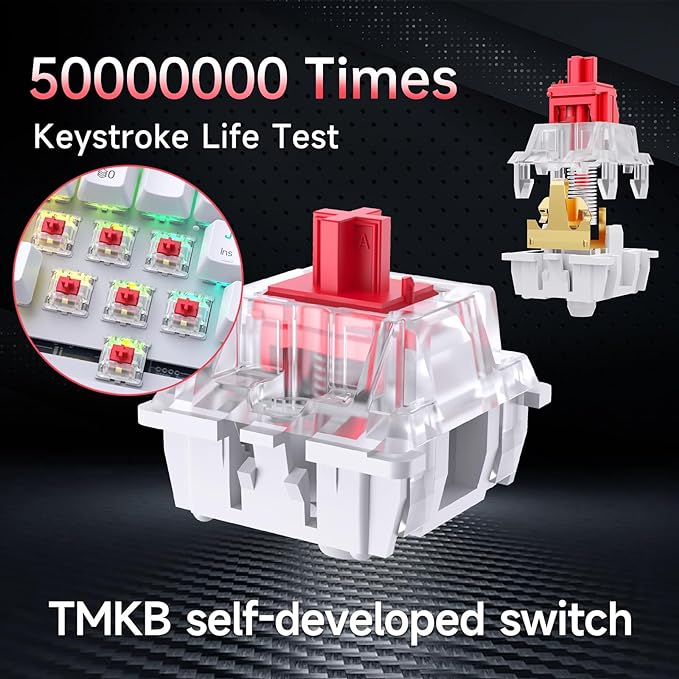 - 【Red Switch – Silent & Smooth】Built with our custom Red switches for a light, linear feel (45g). Smooth keystrokes with no tactile bump and low noise (~40dB) ensure quick, accurate input—perfect for work or gaming. Durable for up to 600,000 presses with consistent performance.
