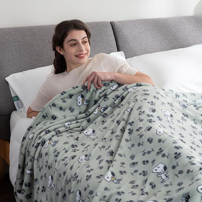 Berkshire Blanket Peanuts® VelvetLoft® Cute Character Snoopy Plush Blanket,Peanuts Snoopy & Woodstock New Flower and Bees Sage,Twin 60 in x 90 in (Official Peanuts® Product)