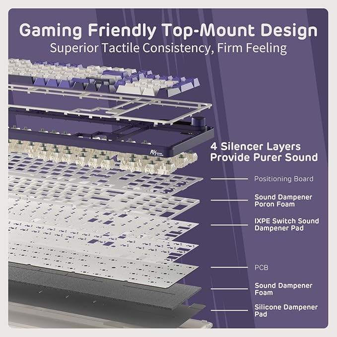 - Sound Absorbing Foams - Equipped with IXPE switch dampener pad, 2 layers of thicker sound-absorbing foams, silicone dampener pad, which reduces 40% noise and removes 80% hallow sound. Bringing creamy or thocky sounding, natural and clear feedback, no more cavities noise.