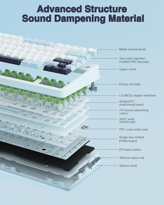 - Hot-swap Custom Keyboard: This custom mechanical keyboard with hot-swappable base supports 3-pin or 5-pin switches replacement. Even keyboard beginners can easily DIY there own keyboards without soldering issue. F75 gaming keyboards equipped with pre-lubricated stabilizers and LEOBOG reaper switches, bring smooth typing feeling and pleasant creamy mechanical sound, provide fast response for exciting game