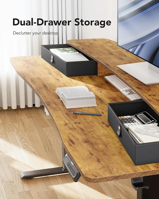 - Efficient Desktop Organization: The electric standing desk maximizes organization with two desktop drawers to store items out of sight and an open storage cubicle for your keyboard, mouse, and other accessories. With a spacious 55″ desktop, you also have plenty of room to display your favorite decorations and collectibles.