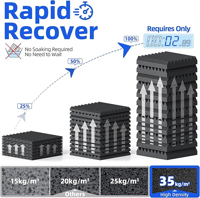- 🚀 Instant Gratification: Bid farewell to tedious soaking and waiting times. Our ready-to-use soundproof wall panels, composed of 100% ultra-resilient PU foam high density material, spring into action, expanding and returning to their optimal shape within seconds of unpacking.
