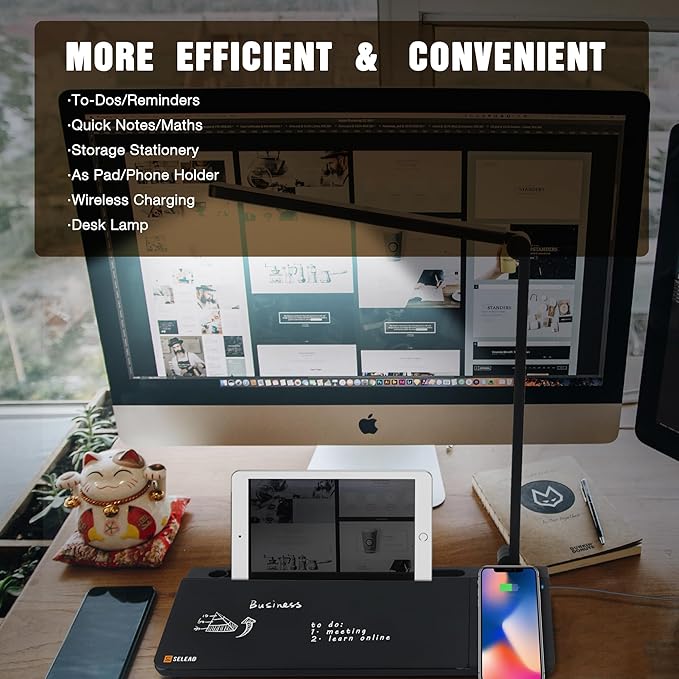 - ā MULTIFUNCTIONAL: Storage, wireless charging, lighting, write, mirror, hold, keyboard stand, our desktop white board is an all in one multipurpose board. Equipped with 1 adapter, 2 black dry erase markers, 1eraser and 5ft USB Type C cable, instructions.