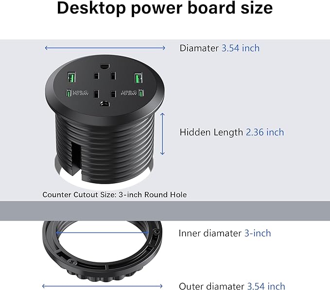 - [Effortless Installation]: Designed to fit a 3 inch standard grommet hole, our desk power grommet is easy to install. Whether using an existing desk hole cover for cables or creating a new one, setup is a breeze. Highlighted by terms like desk hole grommet and desk cord hole cover, it's crafted for convenience.