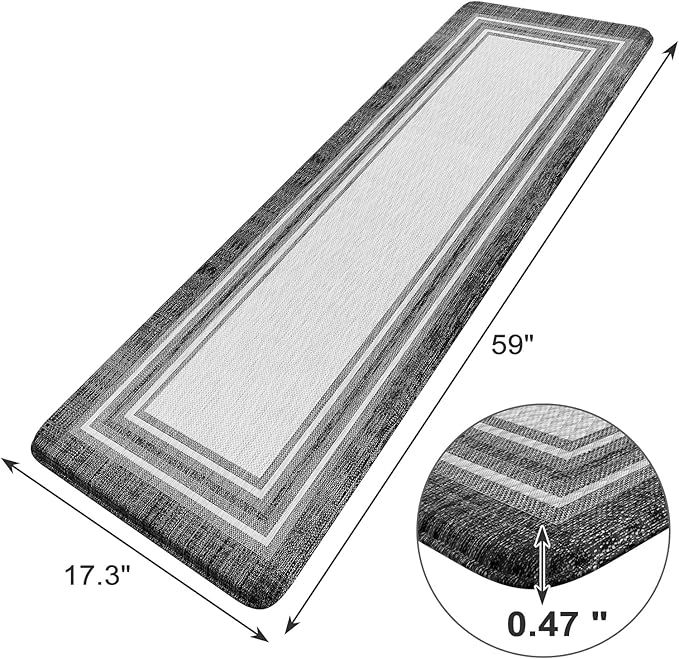 - Anti-fatigue Kitchen Mat : Ergonomic cushioned kitchen floor mats are constructed with 0.47inch (12mm) extra thick, long-lasting anti-fatigue memory foam center providing the ultimate comfort for your feet, back and legs.Feel comfortable like walking on a firm but soft cloud when you are cooking in kitchen or working at your standing desk.