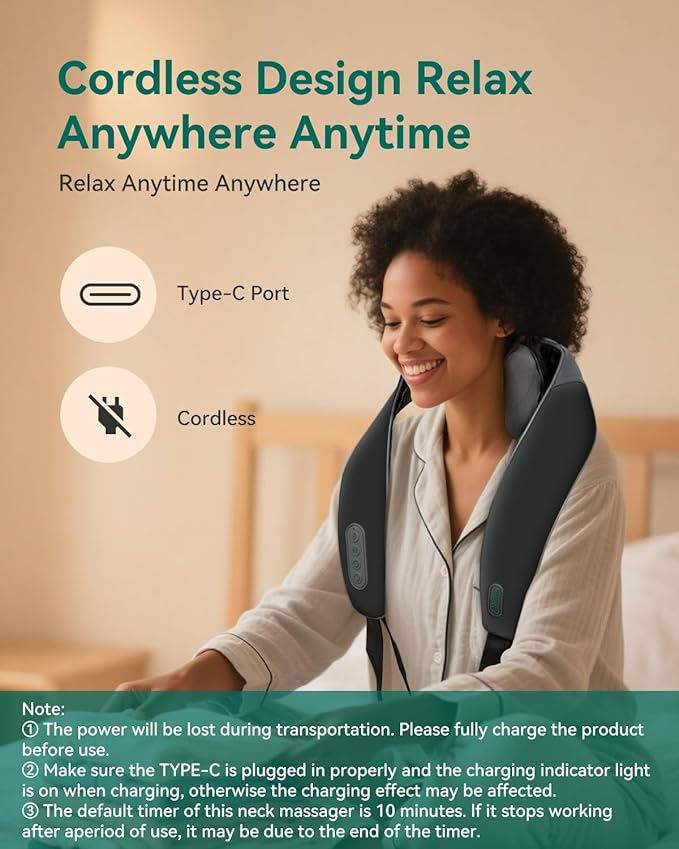 - 【Cordless Freedom for Your Hand】Unshackled by wires, the Snailax cordless massager offers up to 10 sessions on a single charge. With a convenient Type-C plug port for easy charging, our portable neck back massager is your ticket to relaxation, anytime, anywhere – at home, in the office, or on the travel.