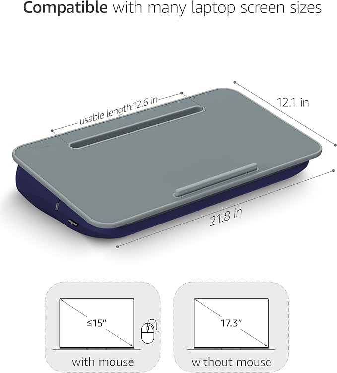 - 2. [Large Workspace]: The desktop of the laptop desk measures 21.8 inches wide and 12.1 inches deep. It can fit laptops up to 17 inches. There is enough surface space for a mouse only when used with laptops that are 15.6" in size or smaller.
