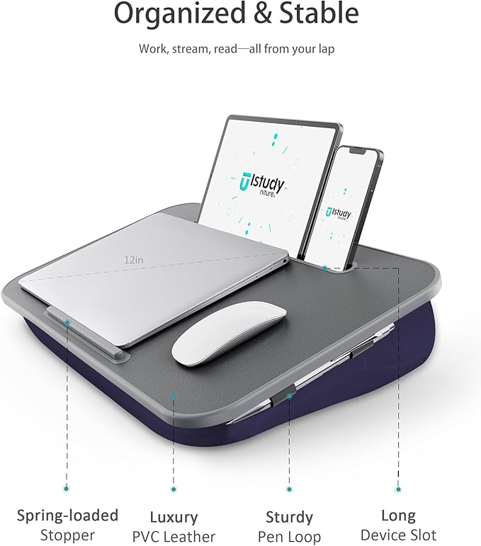 - 4. [Stay Organized Design]: The laptop lap pad comes with a practical design that keeps your desk organized. The spring-loaded stopper keeps your devices from slipping, the Long Device slot for tablet and Phone, the pen holder under the desktop, and the Textured PVC leather surface keep things in place