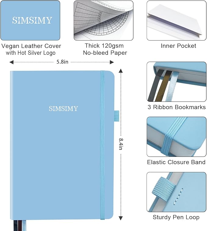 - PREMIUM QUALITY & EXQUISITE DESIGN - Experience durability and elegance with our A5-sized pre-made dotted notebook, featuring a vegan leather cover and bleed-resistant 120gsm paper. Enjoy added features like 3 colorful ribbon bookmarks, a sturdy pen loop, an elastic band, and a back pocket for enhanced functionality.