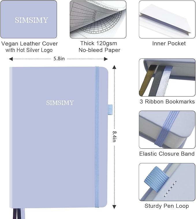 - PREMIUM QUALITY & EXQUISITE DESIGN - Experience durability and elegance with our A5-sized pre-made dotted notebook, featuring a vegan leather cover and bleed-resistant 120gsm paper. Enjoy added features like 3 colorful ribbon bookmarks, a sturdy pen loop, an elastic band, and a back pocket for enhanced functionality.