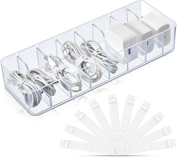 Tatuo 1 Pcs Cable Organizer with 10 Wire Ties, Plastic Cord Storage Charger Box Electronics Organizer with Adjustment Compartments Cable Storage for Drawer Home Office Desk Accessories (Clear)