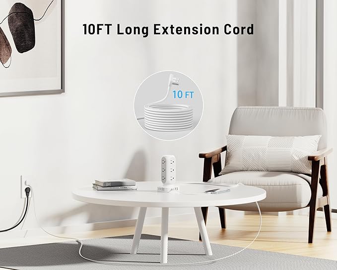 - 【Ultra Thin Flat Plug & 10FT Extension Cord】- With only 0.27 inch ultra thin plug design, the flat plug power strip can easily close to the wall and hide behind sofa or other furniture, 45° right angle plug design prevents bottom plug blocking. 10FT extension cord is made of pure copper, which has better current carrying capacity (15A). The cord is long enough to solve your electricity problem.