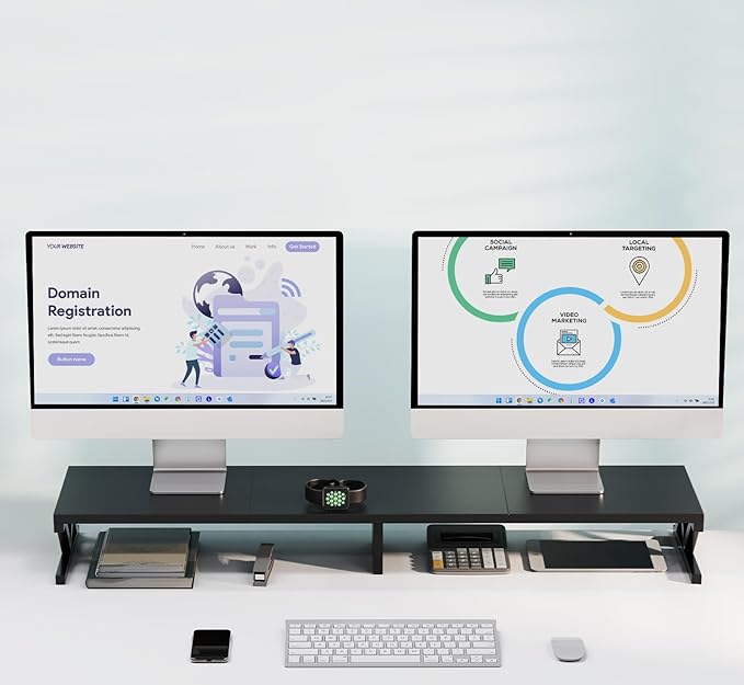 - Large Storage Space: The dual monitor stand riser has extra space for keyboard, sticky notes, mouse, DVD players, iPad and other office supplies. Extra storage space underneath organizes various accessories.