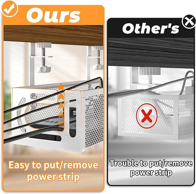 - 【No Drilling Installation】Assembling Foellstoe cable management box is a breeze and takes only 3 minutes or less. The side clamps easily grip the edge of your desk, passing through the side holes, and the basket secures any excess cables.