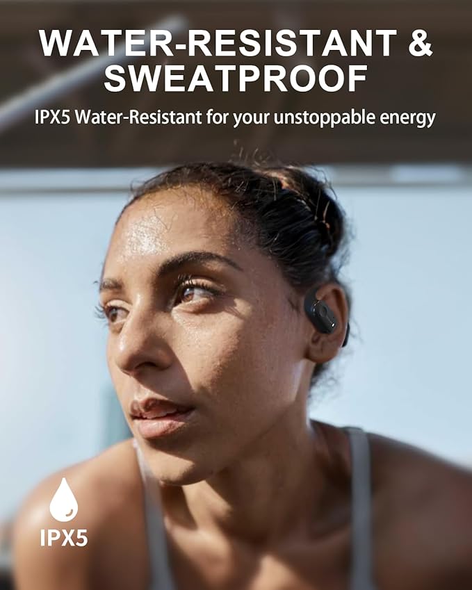 - 【Comfortable Open-Ear & IPX5 Waterproof】With a skin-friendly silicone ear hook, these open ear buds offer extended comfort, easing ear pressure. The ultra-thin memory alloy hook adjusts to different ear shapes. Ideal for outdoor activities, fitness, or office work, providing a lightweight, secure experience. With IPX5 sweat resistance for intense workouts and outdoor use.