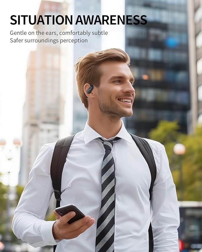 - 【Comfortable Open-Ear & IPX5 Waterproof】With a skin-friendly silicone ear hook, these open ear buds offer extended comfort, easing ear pressure. The ultra-thin memory alloy hook adjusts to different ear shapes. Ideal for outdoor activities, fitness, or office work, providing a lightweight, secure experience. With IPX5 sweat resistance for intense workouts and outdoor use.