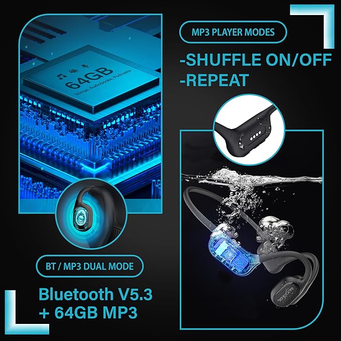 Bone Conduction Swimming Headphones with Bluetooth & 64GB MP3 Player, Shuffle & Repeat, IP68 Waterproof, Secure Fit for Workouts, Running, Cycling and Swimming, Microphone for Hands-free Calls