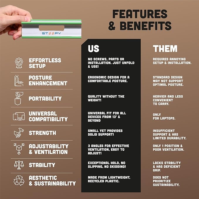 - SETUP'S A BREEZE - Just unfold and go—no screws, no hassle. Instant use, instant time saver! Steepy desk laptop stand is a travel laptop stand made out of strong and durable recycled plastic, with rubber edges to provide the sturdy and stable support your device needs and prevent it from sliding or skidding.