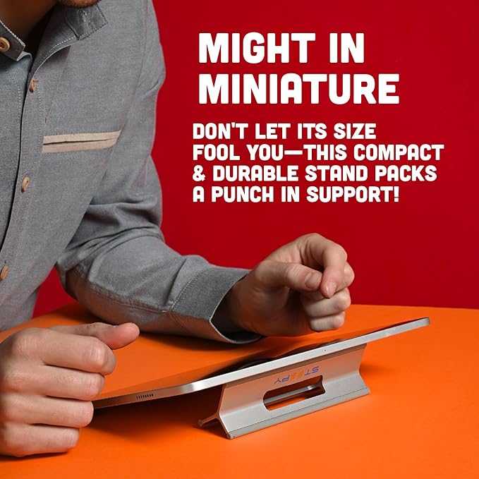 - SETUP'S A BREEZE - Just unfold and go—no screws, no hassle. Instant use, instant time saver! Steepy desk laptop stand is a travel laptop stand made out of strong and durable recycled plastic, with rubber edges to provide the sturdy and stable support your device needs and prevent it from sliding or skidding.
