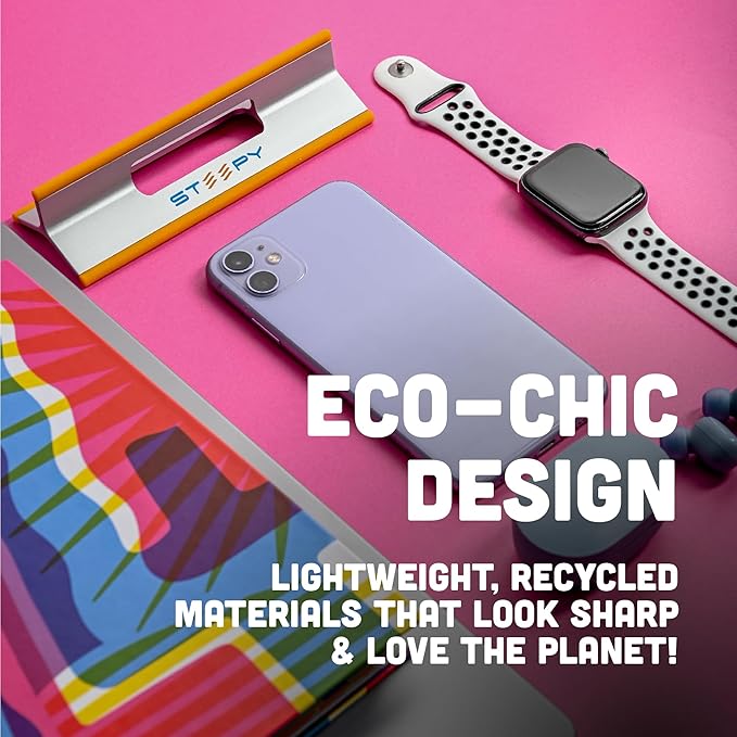 - SETUP'S A BREEZE - Just unfold & go—no screws, no hassle. Instant use, instant time saver! Steepy desk laptop stand is a laptop stand portable made out of strong & durable recycled plastic, with rubber edges to provide the sturdy & stable support your device needs & prevent it from sliding or skidding.