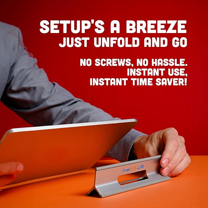 - SETUP'S A BREEZE - Just unfold and go—no screws, no hassle. Instant use, instant time saver! Steepy desk laptop stand is a travel laptop stand made out of strong and durable recycled plastic, with rubber edges to provide the sturdy and stable support your device needs and prevent it from sliding or skidding.