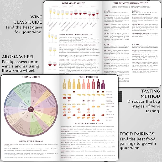 - PERFECT FOR ALL LEVELS, INCLUDING BEGINNERS – Whatever your experience level, this wine journal notebook has all the tools you need to master wine tasting. Inside, you will find detailed instructions, an aroma wheel, a glass guide, and more.