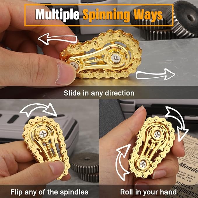 - Multiple Spinning: You can spin it by gripping the button at one end of the chain with your thumb and forefinger, or roll it in your hand and on a table. Creating a relaxing sound like a bicycle chain.