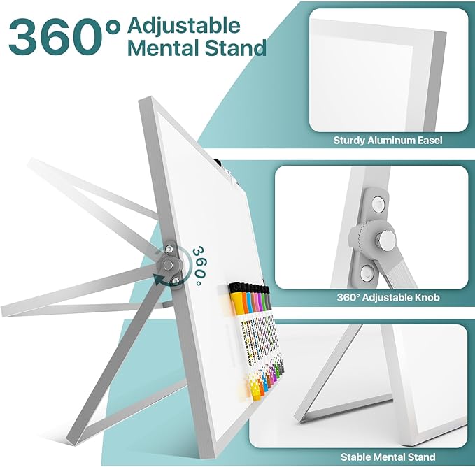 - Portable Dry Erase Whiteboard with Stand; This magnetic desktop whiteboard is lightweight enough for you to take it anywhere. 360° adjustable knob makes it possible for you to adjust the the placement angle you want. The newly upgrade reinforced gear allows the dry erase board to stand stably at all angles. So you can make it place the way you like, convenient for you to write and hold.You can lay it down as a flat whiteboard, or make it stand on a desk
