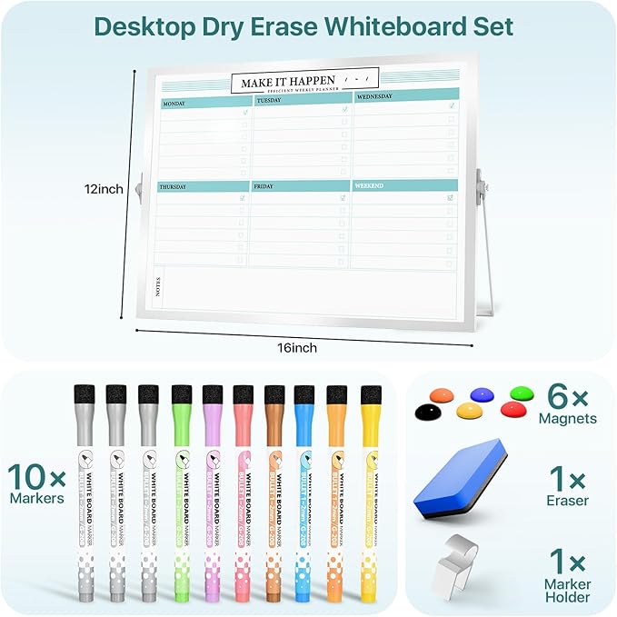 Dry Erase White Board with Stand,Double-Sided Weekly Whiteboard 12"x16",10 Markers,6 Magnets,1 Eraser,Portable Desktop Whiteboard for Planning,Weekly Schedule Board for School for Office