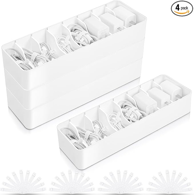 - Nice Combination: you will receive 4 pcs charger organizer boxes (10.2 x 3.9 x 2.4 inches/ 26 x 10 x 6 cm) and 40 pcs silicone wire ties; Our cable management box kit is convenient and easy to clean and store small desk accessories, thus saving space and keeping desk tidy