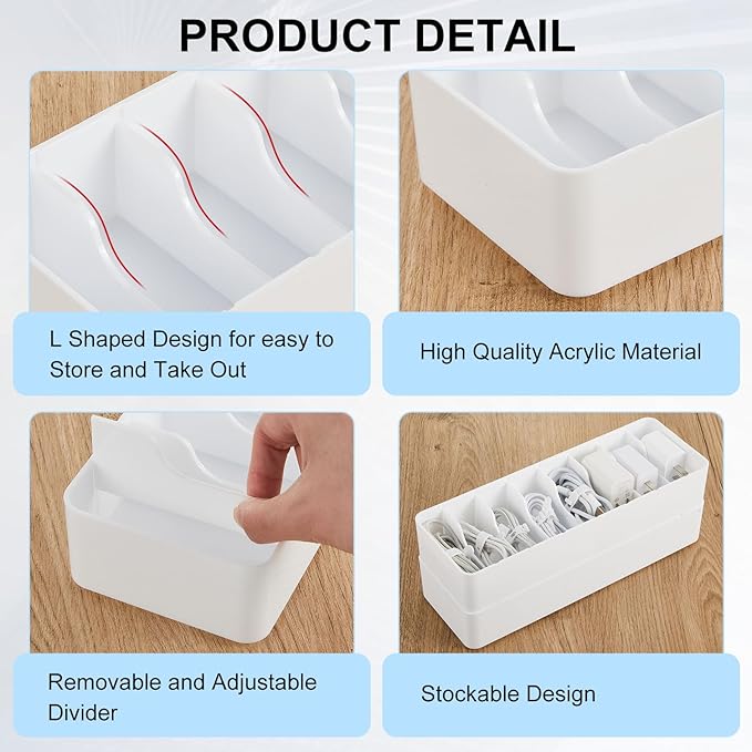 Tatuo 4 Pcs Cable Organizer with 40 Wire Ties, Plastic Cord Storage Charger Box Electronics Organizer with Adjustment Compartments Cable Storage for Drawer Home Office Desk Accessories (White)