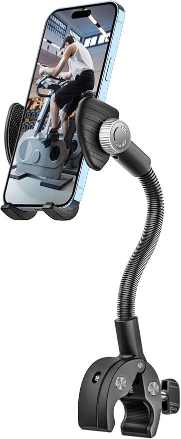 woleyi Gooseneck Phone Mount for Treadmill, Spin Bike Phone Holder Handlebar Clamp for Exercise Bike Peloton, Stationary Indoor Cycling, Stroller, for iPhone 16 Pro Max/15/14/13/12/11, 4-7" Smartphone