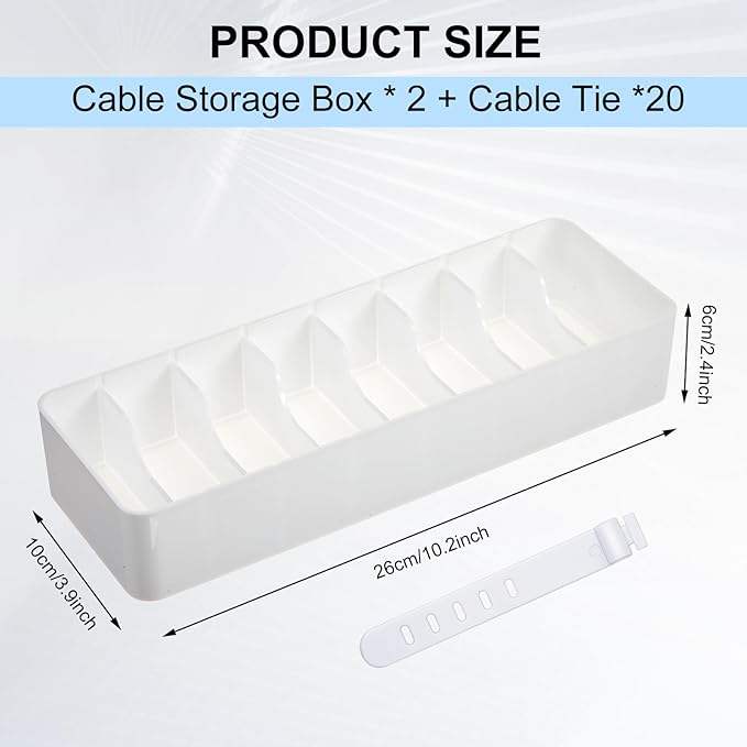 - Nice Combination: you will receive 2 pcs charger organizer boxes (10.2 x 3.9 x 2.4 inches/ 26 x 10 x 6 cm) and 20 pcs silicone wire ties; Our cable management box kit is convenient and easy to clean and store small desk accessories, thus saving space and keeping desk tidy