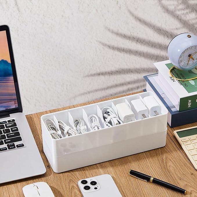 - Multiple Uses: cord storage organizer box is ideal for storing and securing cables, power cords, power banks, earphones, phone chargers etc., also can be served as a cosmetic and jewelry box for storing makeup brushes, earrings, rings, watches, sunglasses, lipstick, eyeshadow, necklaces, etc., even can be applied to organize office supplies, like markers, crayons, clips, notes and more