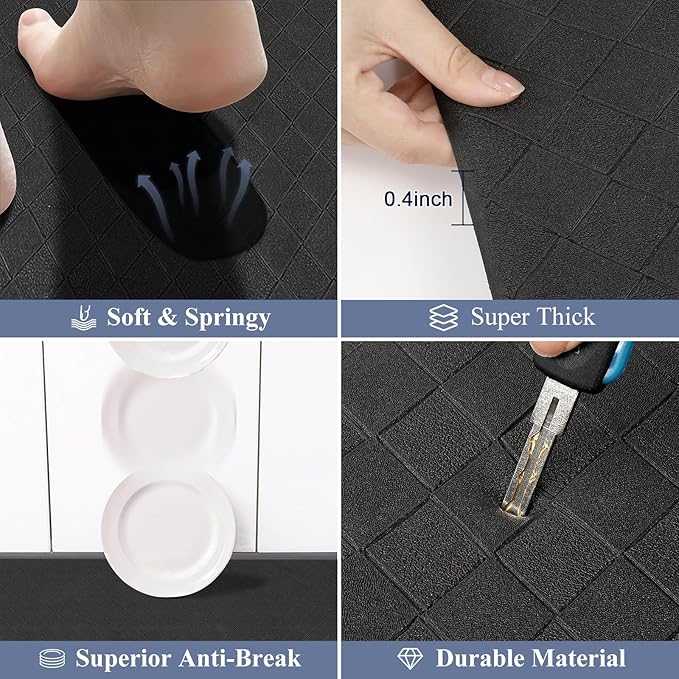 - Comfort Anti-fatigue Mats for Kitchen Floor: 0.4'' thick cushioned anti fatigue kitchen floor mats are ergonomically engineered,so thick and cushioned that you are able to stand comfortably while working in the kitchen or at any work station