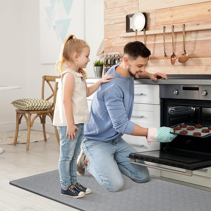 - Comfort Anti-fatigue Mats for Kitchen Floor: 0.4'' thick cushioned anti fatigue kitchen floor mats are ergonomically engineered,so thick and cushioned that you are able to stand comfortably while working in the kitchen or at any work station