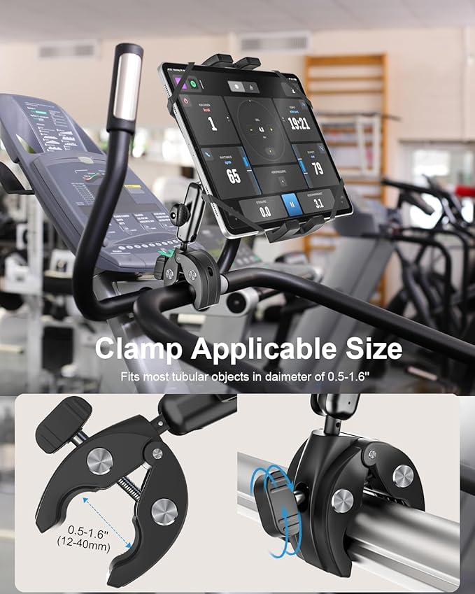 - 【Applicable Range of Clamp Size】This handlebar mount has adjustable clamps and is suitable for most handlebars / poles / tubes (range: 0.5''-1.6'' diameter). You can safely hold the device on spin bike, treadmill,elliptical machine or other equipments in the gym.