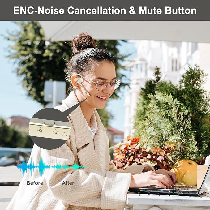 - [ENC&Mute button]: The Bluetooth headphones incorporate Environmental Noise Cancellation technology, which effectively suppresses 90% of ambient noise while preserving the target voice. This advanced feature eliminates various types of interference noise present in the surrounding environment. In special cases, you can also mute your voice through the mute button, but you can still hear the other party's voice.