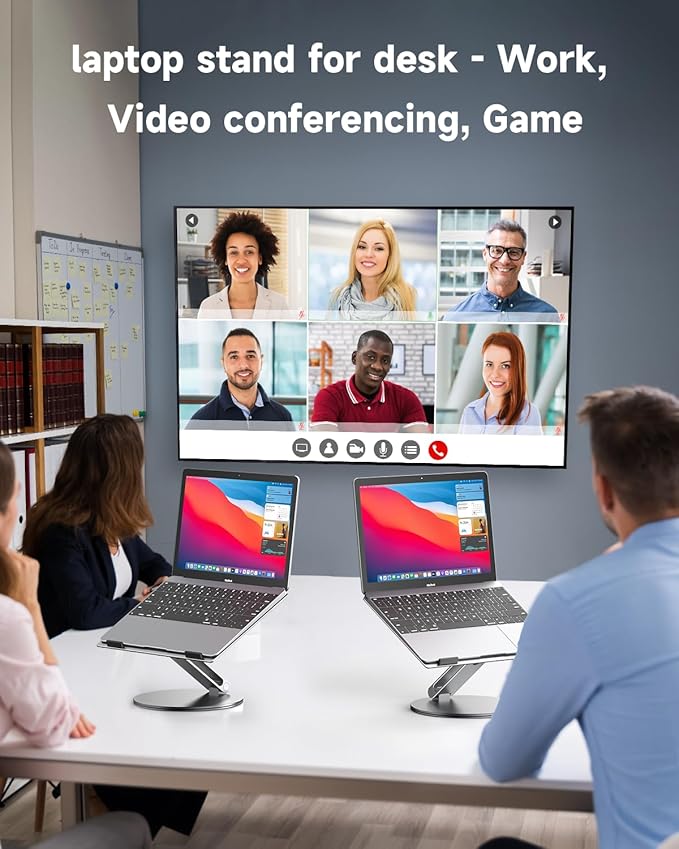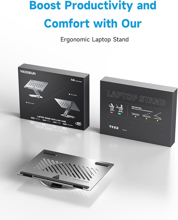 - 【360° Rotation & Adjustable Laptop Stand】: YICOSUN Laptop stand comes with a 360° swivel base, allowing everyone around the desk to easily share the screen, Perfect for cluttered kitchen counter, table or small desk. The tool-free metal hinge riser design enables smooth height and angle adjustment (1.6"-10.2"), which helps reduce neck strain, ideal for long hours of work-from-home, coding, or writing.