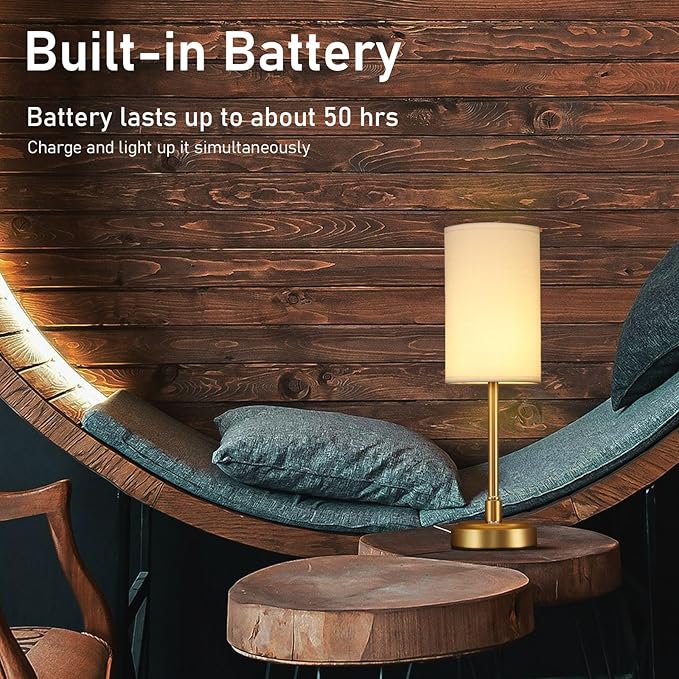 Small Cordless Touch Lamps for Nightstand Lamp Battery Operated Rechargeable Lamp, Portable 3 Colors Stepless Dimmable Fabric Shade Night Light for Restaurant/Bedroom/Outdoor (White+Brass)