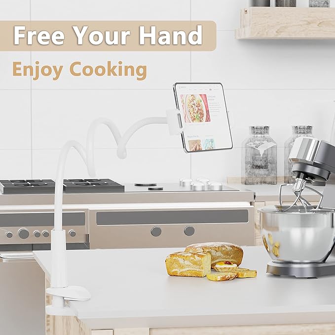Tablet Stand Holder, Mount Holder Clip with Grip Flexible Long Arm Gooseneck Compatible with ipad iPhone/Nintendo Switch/Samsung Galaxy Tabs/Amazon Kindle Fire HD (New White)