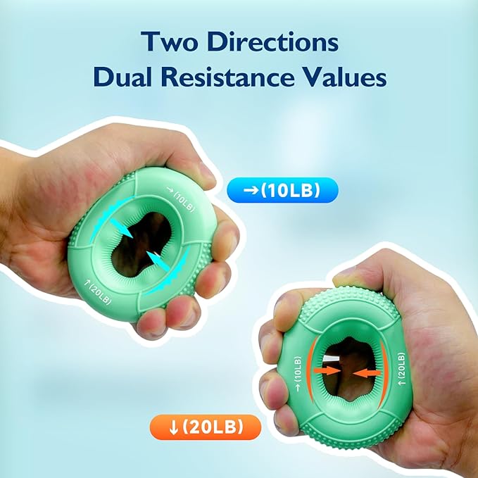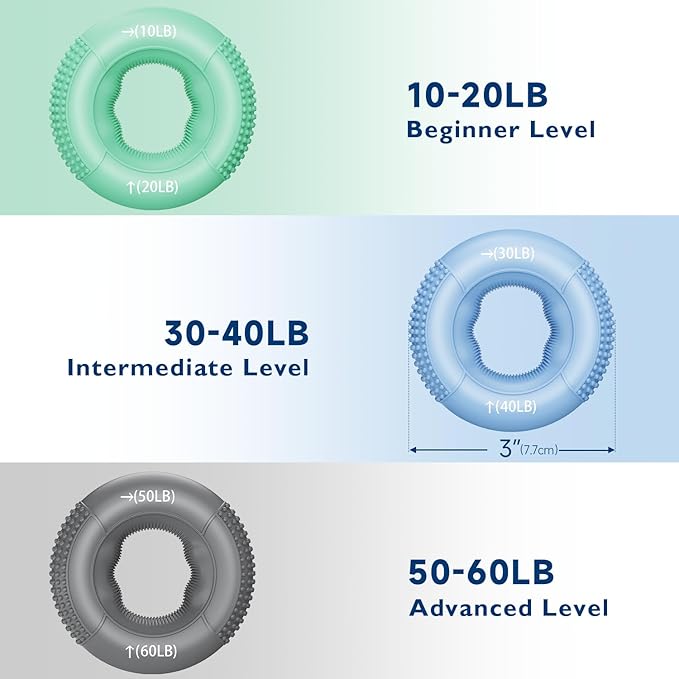 - 𝗟𝗼𝗻𝗴-𝗹𝗮𝘀𝘁𝗶𝗻𝗴 & 𝗙𝗹𝗲𝘅𝗶𝗯𝗹𝗲 𝗚𝗿𝗶𝗽 𝗥𝗶𝗻𝗴𝘀: Advance your hand strength with our progressive hand gripper rings, offering adjustable resistance from a gentle 10-20LB to a tough 50-60LB. Each ring is made from premium food-grade silicone, ensuring lasting elasticity and shape retention. The non-slip textured surface provides a secure and comfortable grip.