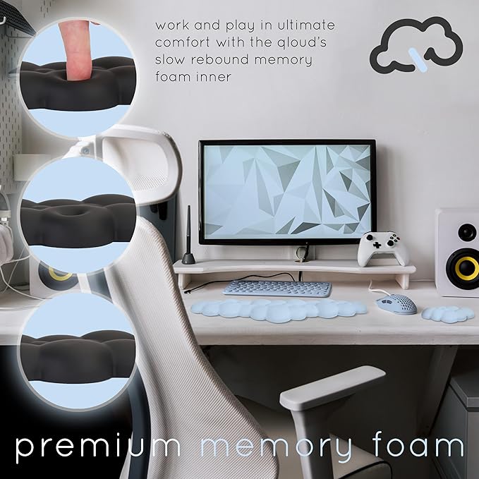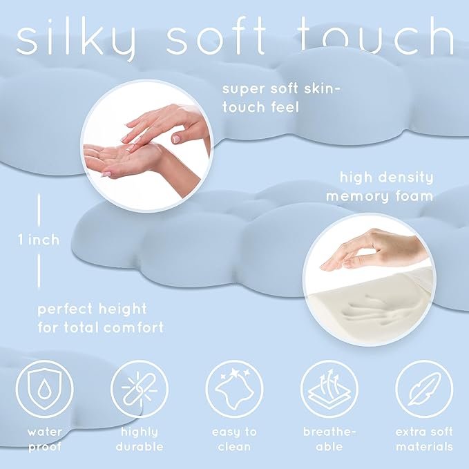 - CLOUD SOFT COMFORT - A premium high density memory foam cloud wrist pad arm rest for keyboard with a new soft-touch breathable material that is ultra comfortable against your skin. This cute and squishy cloud keyboard pad with wrist support is durable and contoured perfectly for you. A keyboard hand rest that is the perfect gaming keyboard wrist rest with wrist support for keyboard rest wrist pad. A super comfy desk wrist rest cloud desk pad